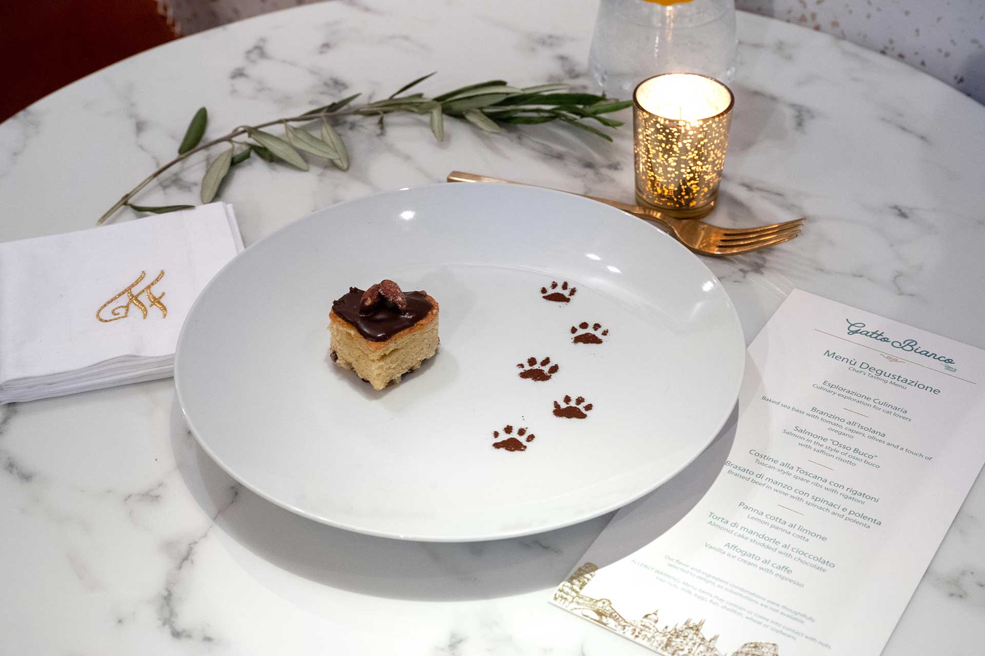 The dishes—created by Fancy Feast’s in-house chef Amanda Hassner and Michelin Star-winning Italian chef Cesare Casella—drew inspiration from Fancy Feast Medleys recipes but were designed for human consumption. The food was intended to “mirror the sensory experience of cats at mealtime.” Lucky guests who reserved their spots via OpenTable were able to enjoy an exclusive private dining experience and the added bonus of dining alongside our celebrity guest: the Fancy Feast Cat.