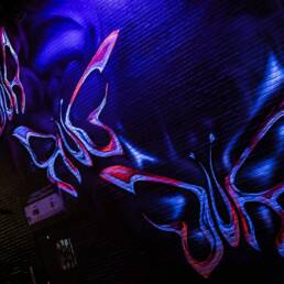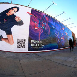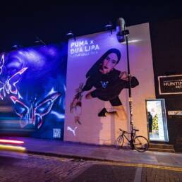 We created hand-painted murals in North America and Europe to further evolve the collab’s butterfly motif. Symbolizing the changes caterpillars undergo as they become butterflies, the striking visual transforms as day turns to night with fluorescent paint and black light—bringing even more wow-factor to the PUMA x DUA LIPA mural installation.